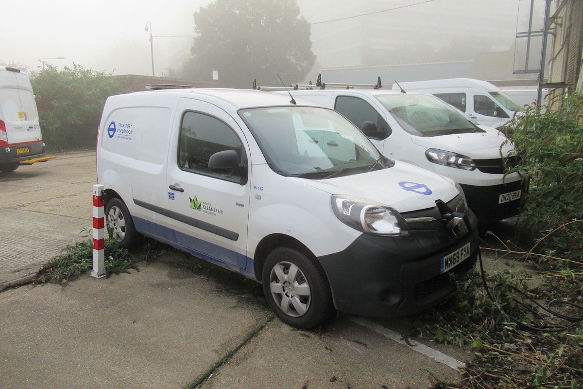 Details: There was still a morning mist in the air when Ray visited Acton Works on 9th October 2021. Present that day were two of the five Renault Kangoo vans supplied to TfL in January 2020. Diesel 9117R was in the front car park, while electric 9115R (shown here) was plugged in in the van yard. Could it be that these vans are going to be transferred to replace the electric+hydrogen Kangoos latterly used on internal mail duties? |