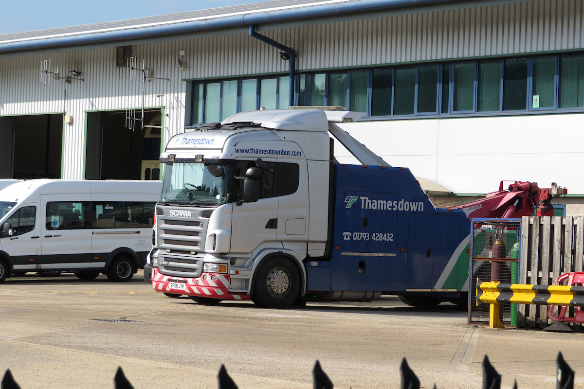 Details: Bus services in the Wiltshire town of Swindon were for many years provided by the council-owned Thamesdown Transport. It was eventually sold to the Go-Ahead group in 2017, leaving fewer than ten UK bus companies running as 'municipals'. Go-Ahead combined the operation with its existing Go South Coast fleet, though the actual fleetname was changed to 'Swindon's bus company'. Andrew visited their depot on 22nd September 2021 and photographed Scania R480 recovery truck SF08JYR still carrying the now defunct fleetname. The name is also most likely carried by the preserved double-deck bus hiding inside the building behind. Parked alongside were three Ford Transit minibuses in plain white, believed to be in use as crew ferry vehicles but carrying 'Go South Coast' legal lettering. |