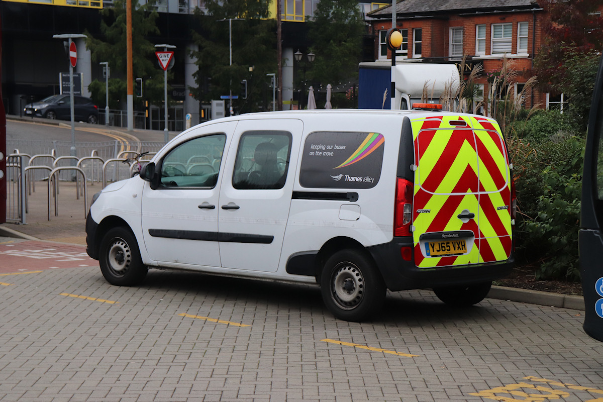 Details: Talking of municipals in the west, I was surprised to read that Reading Transport is still council-owned. What has that got to do with this Thames Valley service vehicle you may wonder. Well, Reading bought out 'independent' operator Courtney Buses in 2019 and started using the 'Thames Valley' fleetname for their services. This name harks back to the traditional operator that merged with Aldershot and District to form the NBC subsidiary Alder Valley. The vehicle shown here was originally with Courtney, as was similar LS14HGE, which was shown on LTSV last spring. In fact LS14HGE was parked nearby when Derek photographed YJ65VXH at Bracknell Bus Station on 18th October 2021, both vehicles carrying the same livery of white with a grey panel (looking like an additional window at first glance). As with LS14HGE, YJ65VXH looks like a Renault Kangoo but is in fact a Mercedes Citan. |