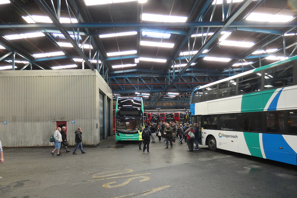 Details: Another photo from the Plumstead Garage open day on 30th October 2021, this one was taken from almost the same position as the last, but looking south-east towards the (out-of-sight) entrance. One end of the long 'shed' is visible on the left, while another maintenance area (with 5 pits) is behind the line-up of red buses in the background. This part of the garage was given over to a display of current vehicles, including types currently operated by Plumstead as well as visitors from various other Stagecoach group garages in London and beyond. |