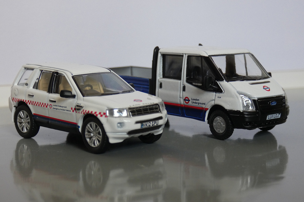 Details: As mentioned here a couple of years ago, Oxford Diecast has been producing various OO scale (1:76) road vehicle models decorated as London service vehicles. I recently managed to obtain two more of the models released so far, these being the Land Rover Freelander and Ford Transit Mk7 dropside truck, both in LUL white/blue/red livery. The detail and finish on both models is very good, although this large photo does highlight a couple of areas that could be improved with a bit of touch painting. Bear in mind that the car on the left is only 2 inches long! As with the vans shown earlier, the Land Rover comes in a small box and retails for around 5-6 pounds. The dropside truck requires the use of a considerably larger box and, perhaps as a result, seems relatively over-priced at 12-15 pounds. |