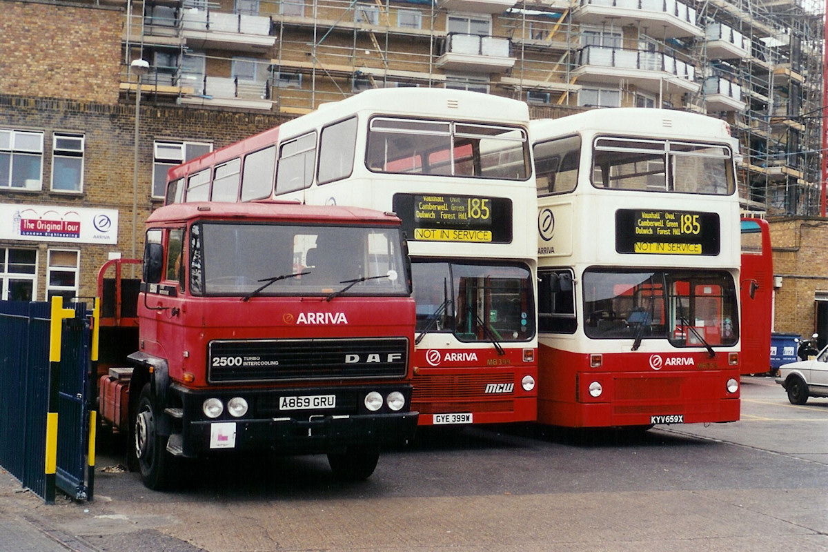 Details: This photo shows how peripheral details in a photograph can sometimes provide new information about a particular service vehicle. The main subject is DAF 2500 articulated lorry A869GRU, one of a pair acquired second-hand by London Coaches in the late 1980s to serve as driver training vehicles. London Coaches had evolved from the Tours and Charters section of London Buses, and ran open-top buses on London sightseeing tours and coaches on excursions and commuter services. It initially used Battersea bus garage before moving to the larger garage in Wandsworth. One of the first parts of London Buses to be privatised (in 1992), it was re-sold in late 1997 to Arriva, the recently-adopted new name for the Cowie Group. A869GRU was allocated fleetnumber DT1 on paper (with DT2 being similar B221PFX), and was thought to have been sold in about 2001. However, this undated photo has some clues that indicate it was taken in late-2002. The two buses alongside are MCW Metrobus double-deckers, many of which were transferred from the former Leaside and South London fleets under Arriva ownership. Most were converted to open top but this pair are closed top and, more interestingly, are blinded for London bus route 185. At the start of the new millennium there was an effort made by LRT/TfL to attract more companies to bid to run London bus services. One of the results was the unlikely involvement of Durham Travel Services, a company that had only been created a couple of years previously and which mainly ran National Express coach services from a base in Peterlee in the North East. Perhaps unsurprisingly, the company chose to use a different fleetname (London Easylink) when it was awarded the tender to operate route 185 in early 2001. It later added single-deck route 42 (which had earlier been operated from the National London base in Catford), but in August 2002 the company went into receivership. At 3pm on the 21st, all drivers working on the two routes were radioed and told to disembark their passengers and return to the depot immediately, where the buses were effectively impounded. This was an unprecedented and intolerable situation and within a few hours a limited service was restored to both routes using buses from various operators. Blue Triangle was tasked with coordinating the service on route 185 but, not having enough buses of its own, also employed an amazing variety of vehicles from Amberlee, Carousel, First London, London Central, Metrobus, Red Route and Sullivan Buses. From early September, 'Arriva The Original London Sightseeing Tour' became involved, this being the new name for the former London Coaches sightseeing operation and usually abbreviated (thankfully) to Arriva TOLST! They used closed-top Metrobuses, initially without blinds, though as this photo shows, fairly good blind displays were soon sourced. After six months the service was reassigned to East Thames Buses, at the time TfL's in-house 'operator of last resort', and used the buses originally acquired by Durham Travel to run the route! It was not to be the last time the 185 was involved in complications though, as I tried to describe back in 2006. The bottom line (finally!) is that A869GRU remained in stock until at least late-2002, and I will update the database shortly. |