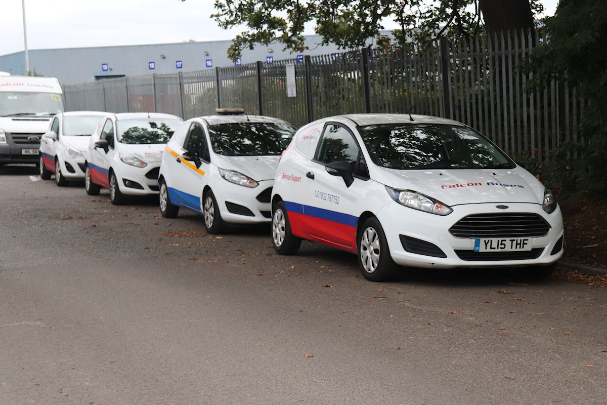 Details: Derek caught another line-up of service vehicles, this time at Falcon Buses' Byfleet base on 24th October 2021. Falcon has applied a smart white, red and blue livery to its fleet, including most of its service vehicles. This is shown on Ford Fiesta vans YL15THF and KO16SXX and also on Vauxhall Corsa van EY62UCN at the back. The interloper is Ford Fiesta van BF16MHV, still in as-acquired white/blue. |