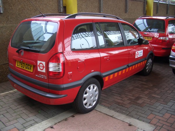 Details: This view of Vauxhall Zafira estate 5562V (LT53GGX) at Uxbridge Bus Station on 28th May 2004 shows the Dual Fuel badging and the additional LPG filler cap. It also provides an interesting comparison between the designs of the Zafira and Galaxy cars, the vehicle in front being Galaxy VU53NUA. |
