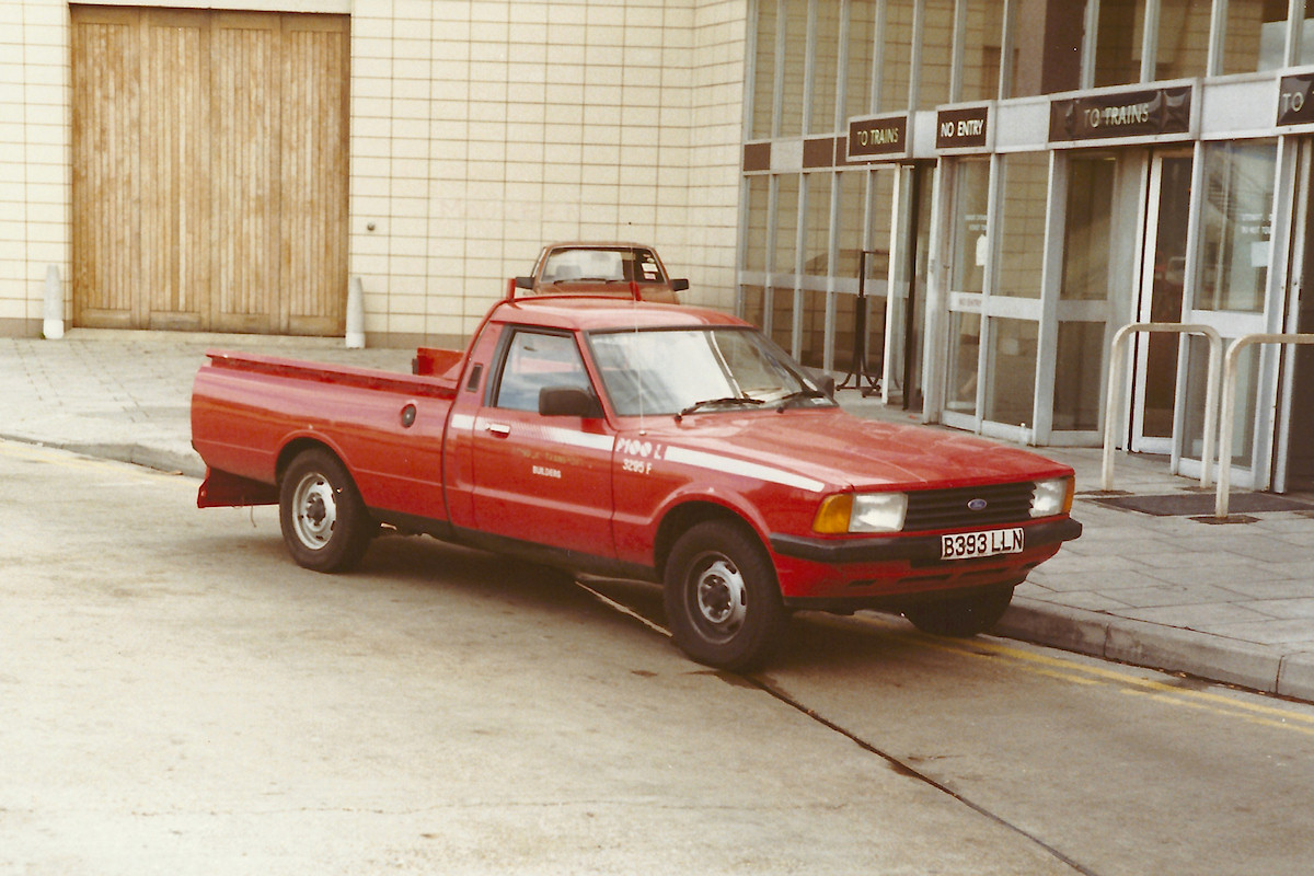 Details: The Ford P100 was available in the UK from 1982 onwards and married the front end of the Cortina car to a pick-up style rear end. In 1988 it was replaced by a new variant, based on the Ford Sierra. London Transport leased just six examples of the original model, three each in 1984 and 1986. 3295F was new in late 1984 and was allocated to LT Builders at Parsons Green. Photographed at Hatton Cross Station on 5th November 1985, the dropping tail-gate can be seen. Note the large doors in the station building. I have never seen these open but they presumably lead to an equipment room of some sort, and are large enough for a vehicle to enter. A couple of Ford Transit vans were officially allocated to Hatton Cross at this time (assigned to the Permanent Way Manager), though I don't know if they were actually kept here. |