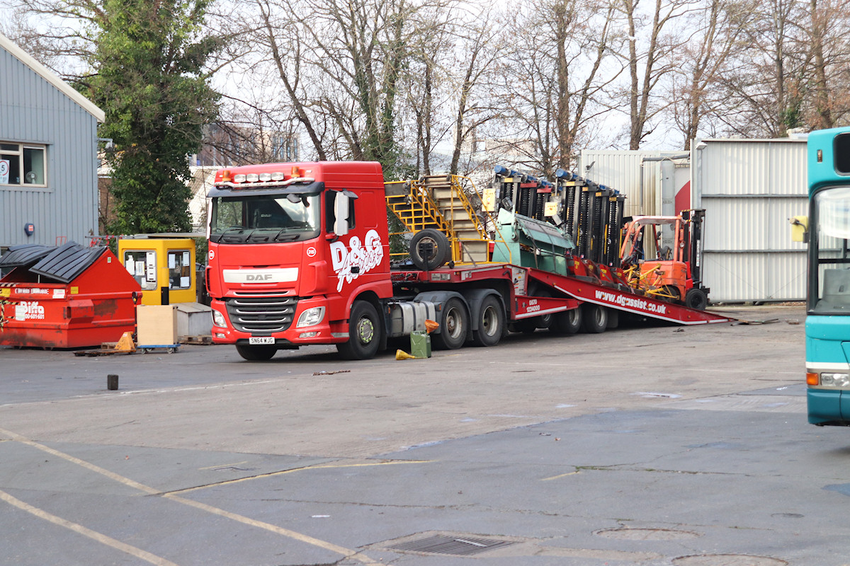Details: As mentioned recently, Arriva closed its former London Transport garage in Guildford on 17th December 2021, bus services passing to other companies. When Derek visited on 21st December, only one Arriva bus was present (Dennis Dart 1558 KX56HCP, on the right) was present, while work was underway to recover reusable equipment. SN64WJG, a DAF artic lorry of D&G Assist was loaded with steps, vehicle jacks, a metal press and a fork-lift truck. The curious trailer is of a type shown on LTSV before, whereby the rear of the trailer is lowered to ground level by moving the wheels forward. |