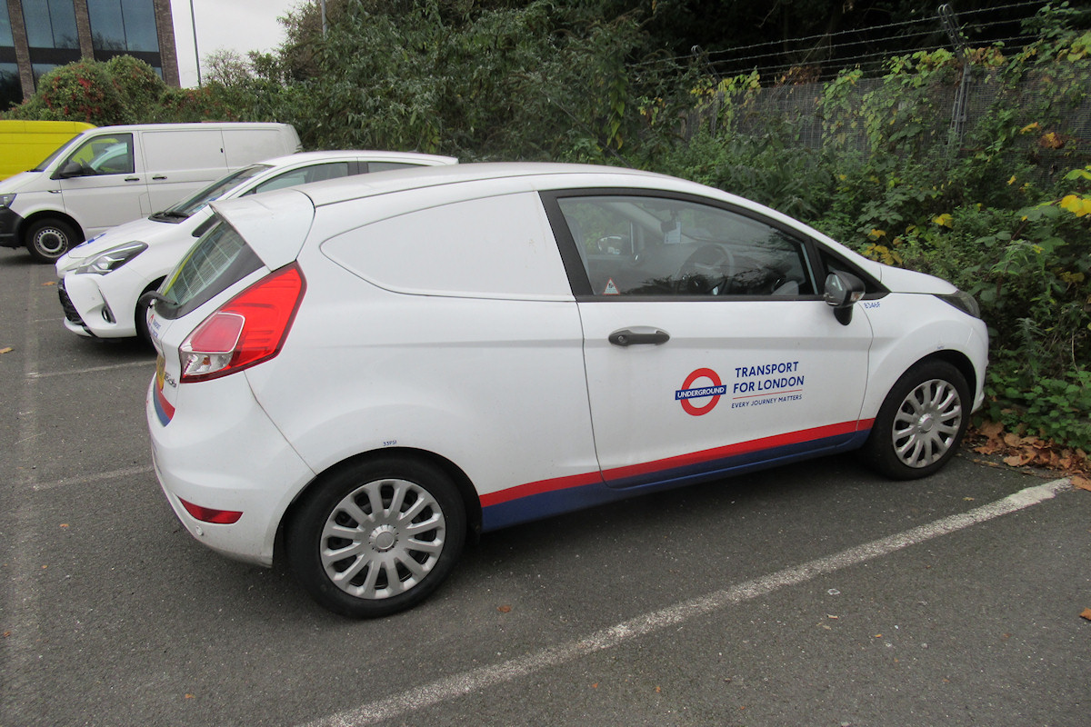 Details: Ford Fiesta van 8346F has been fairly elusive since it was delivered in late 2016. Seen once at Baker Street at night, the only other reports were when it was visiting Acton Works. Ray found it in the car park there on 20th November 2021. In the background is TfL-branded Toyota Yaris car 8597T, and this angle highlights the slightly protruding 'nose' of the current design. |