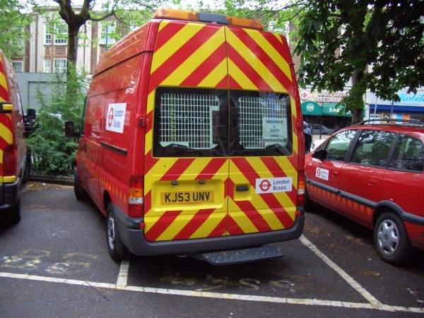 Details: This rear view of Ford Transit van 5584F (KJ53UNV) shows the extra height of the High-Roof version of the Transit. The label in the rear window reads Wandsworth & Merton Response Van, although the picture was taken at Sycamore House, Thornton Heath on 1st June 2004. |