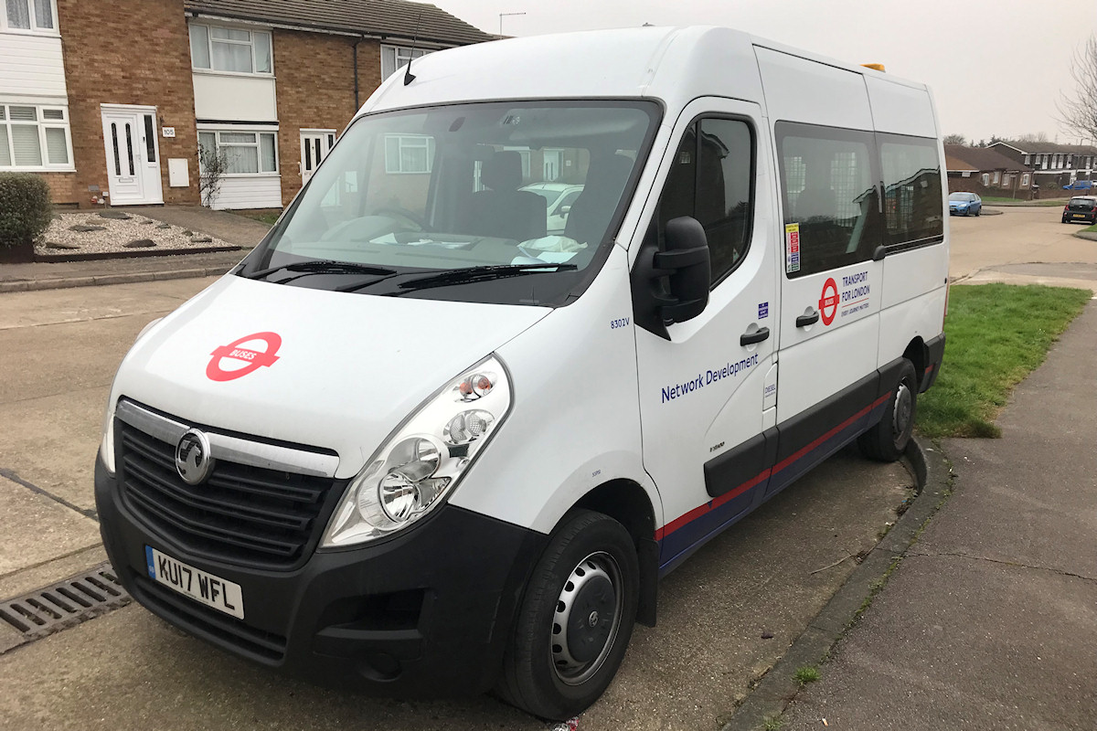 Details: Vauxhall Movano minibus 8302V makes its fifth appearance on LTSV with this photo taken on the oddly named Thors Oak (no apostrophe) in Stanford-le-Hope, Essex, on 25th January 2022. 8302V was one of three similar vehicles leased in spring 2017 for use by London Buses on passenger survey work. They were given a livery of white and blue with a red stripe, very similar to the standard LUL livery but with all-red roundels. It is thought that this was to become the new standard livery for LBSL service vehicles (it was also applied to five Toyota Yaris cars), though it seems to have later been dropped in favour of generic TfL white/blue. The minibuses were originally based at Chancel Street in Southwark, though their current home is not known. It is also possible that the COVID-19 pandemic has seen them switched to other roles, as a couple of sightings have suggested they were working for LUL. |
