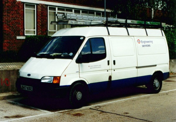 Details: A longer wheelbase Ford Transit van, complete with roof racks for ladders, was 4419F (L947KBE). This 190 model was leased in 1994 and was lettered for the Signals and electrical contractors when photographed at Acton. |