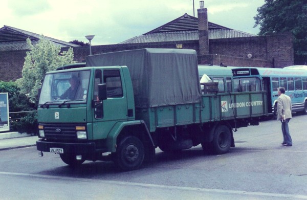 Details: 51F (VNJ192Y) was a Ford Cargo 1011 Dropside Lorry operated by London Country Bus Services. It was photographed on 27th June 1985 leaving Addlestone garage. In the background are a pair of SNB-class Leyland National buses, one of which carries an advertising livery. |