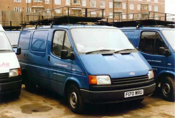 Details: 3731F-3736F were a batch of Ford Transit vans leased in Autumn 1989 for use by the Lift & Escalator Manager at Griffith House. A number of these are seen at home on 27th February 1991, headed by 3732F (F170WRU). Note the LUL blue livery and large roof racks carried. |