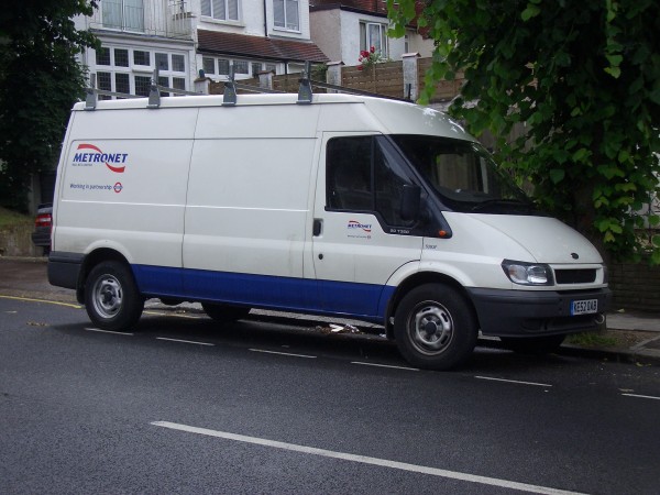 Details: This standard (ie 90 T350, long-wheelbase, mid-height, with roof-rack) Ford Transit van was found parked near Golders Green on June 26th 2004. Carrying Metronet BCV logos, it was numbered 5393F (KE52OAB). |