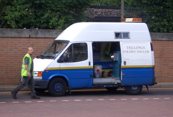 Details: A slightly badly timed shot taken at Kingston Cromwell Road bus station on July 1st 2004 shows Tellings Golden Miller Ford Transit service van N366HLA attending to a troublesome Dennis Dart. This vehicle is unusual for being a high-roof yet short-wheelbase version, rather like London General T660NGW, and also for having small windows in the roof. |
