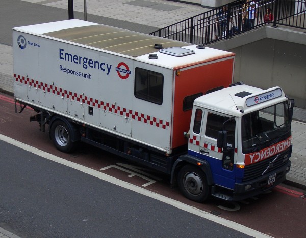 Details: This picture taken from the footbridge over York Road, Waterloo on 14th July 2004 shows one of the ERU Volvo FL6 demountable trucks awaiting the return of its crew. The only changes to 2566V (S266KRX) since it was new in 1999 are the addition of the Tube Lines logo towards the rear, and the removal of the offside fleetnumber. It still carried demountable body DB4, and this view shows the partitioned crew compartment towards the front, and the side lockers. While the crew compartment is provided with windows to side, front and top, the main part of the body has translucent roof panels to offer illumination. Note also the fuel filler point between the lockers, most likely to supply a generator. |
