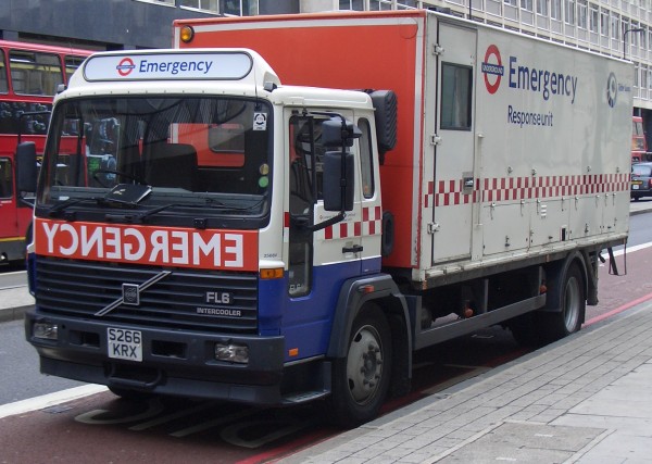 Details: Another view of Volvo FL6 demountable 2566V (S266KRX) parked near Waterloo station on 14th July 2004 shows the nearside access door to the crew compartment. These bodies (in this case DB4) were originally carried by Mercedes-Benz 814 trucks like 2496M. |
