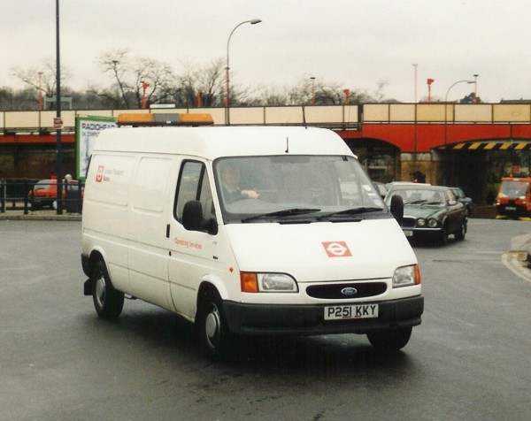 Details: 4718F to 4726F were long-wheelbase Ford Transit vans used by London Transport Buses from 1996 until about 2001. 4723F (P251KKY) was photographed at Lewisham on 31st January 1998. |