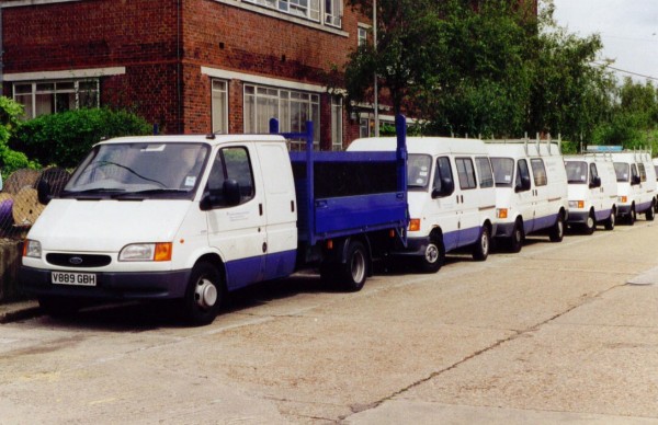 Details: This picture taken at Acton works shows just a few of the varieties of Ford Transits that have been used as service vehicles. At the front is 4998F (V889GBH), a long-wheelbase Transit 190 dropside truck, with crew-cab and tail-lift, delivered in 1999. Behind it are a short wheelbase minibus, a long wheelbase crew van, a short wheelbase van, and a further crew van. For even more differences, look at the roof heights and wheel trims! |