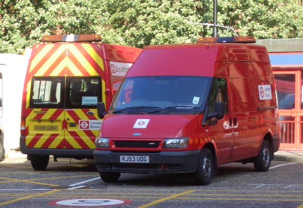 Details: Allocated to Aldgate Bus Station since delivery in early 2004, 5589F (KJ53UOG) is one of 12 Ford Transit 125 T300 High-Roof vans leased for use by London Buses. It was photographed on 23rd July 2004, parked next to Mobile Information van 5040F. |