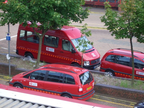 Details: Seen from the railway platform at Eltham Station on 24th July 2004, this view of LT35 minibus 5613VW (RJ04WOB) shows the Combi layout, with a mix of seats and cargo space. The other two vehicles are Vauxhall Zafiras 5572V (LT53GEU) and 5573V (LT53GJE). |