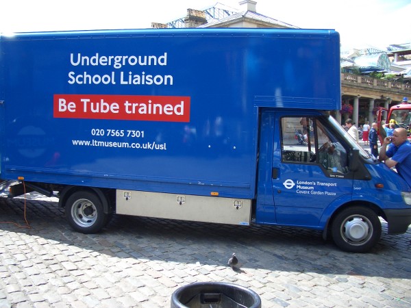 Details: A tight view of the offside of Ford Transit 125 T350 Luton Van 5494F (KJ53UNW) at Covent Garden on August 4th 2004 shows the prominent lettering and underfloor lockers. |
