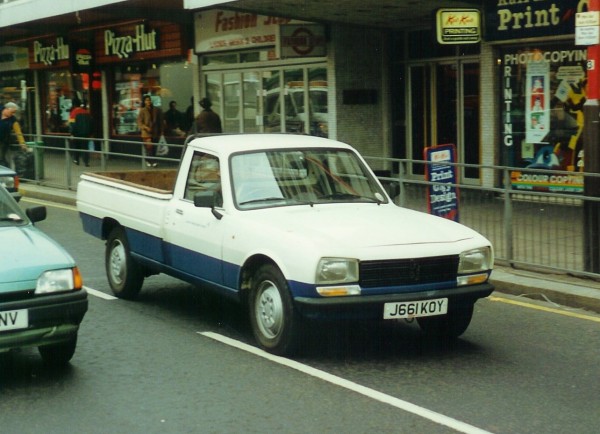 Details: Seen passing Hounslow bus station on 22nd October 1991 is Peugeot 504 pick-up 4081P (J661KOY). New in August 1991, this was the only such vehicle reported in the white and blue livery, most of the 22 examples leased between 1987 and 1993 being in red for use as bus engineering support vehicles. |