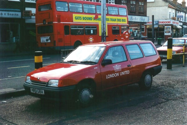 Details: Vauxhall Astra 3-door estate car 4079B (H851GBA) had been in service just one month when photographed at Hounslow bus station on 2nd May 1991. It carries a large London United logo and one of the illuminated roof roundels. |