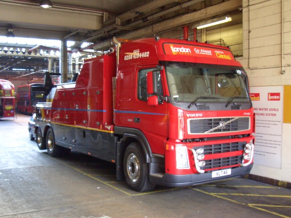 Details: Seen resting between duties at Putney garage on 30th August 2004 was the Go-Ahead group's new bus recovery truck. Volvo FM12 420 VLT46 carried the logos of both the London Central and London General companies. The Boniface bodywork had an additional load-carrying axle (seen retracted here) and an extendable boom capable of lifting up to 22 tonnes. |