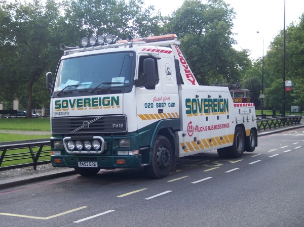 Details: Sovereign do a lot of bus recovery work in London, and their vehicles can often be seen on stand-by at Park Lane. This Volvo FH12 registered R453ERE is an example with a lifting rear axle, and plenty of front-mounted lights! |
