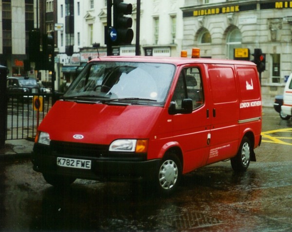 Details: A batch of Ford Transit vans delivered in November 1992 was divided among a number of bus garages, 4251F (K782FWE) being sent to Finchley. The van, pictured after a shower in Grosvenor Gardens on 23rd February 1994, carried the logo and legal lettering of the London Northern bus operating unit, and was also fitted with smart wheeltrims. |