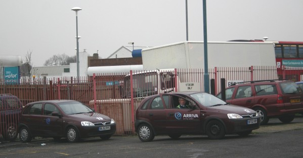 Details: This view of the yard at Enfield Bus Garage on a gloomy winter 2004 day shows a few service vehicles. To the fore are a pair of brown Vauxhall Corsa 5-door hatchback cars, clearly lettered as Arriva vehicles. They are numbered 12 (BT02KBF) and 13 (BL02RYC). The lorry in the background may be DAF S737SLF but this is not confirmed. |