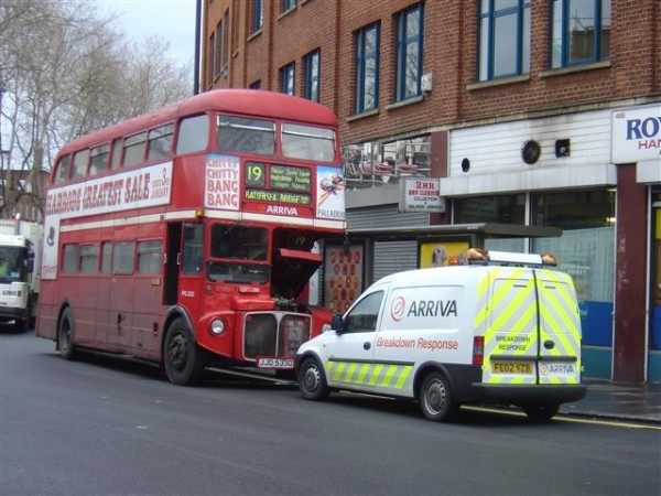 Details: The Arriva bus companies in London make use of a number of Vauxhall Combo vans, most of which carry a plain white livery. An exception to this is FE02VZB based at Brixton garage and used as a Breakdown Response vehicle with appropriate markings and lettering. On 12th February 2005 it was found attending to an ailing RML2533 in Roseberry Avenue. The 19 is scheduled to lose its Routemasters in early April 2005, leaving just five routes with crew operation. |