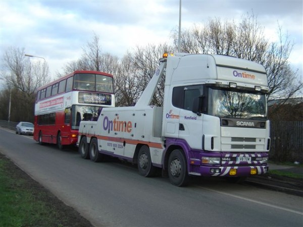 Details: As well as Sovereign, another firm contracted to provide a bus recovery service in London is Ontime. Their Scania 144 with appropriate V8TOW registration was caught on film at Northolt on 19th February 2005. On tow is one of the V-class Volvo Olympians allocated to First's Uxbridge Garage for express route 607. |