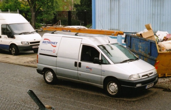 Details: A double rarity is captured here, with an unusual livery on an unusual vehicle. Five Peugeot Expert vans have been operated in recent years, two of which carried this silver livery. 5436P (LG03BWJ) can often be seen from the train at Acton Town but has proved difficult to photograph. Colin Smith caught this fine view in April 2005. In the background is Ford Transit van 5439F (KJ03DXL). |