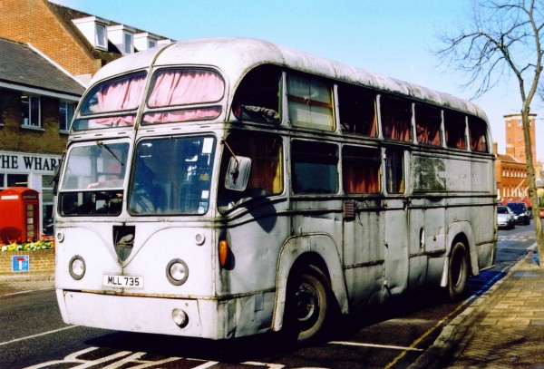 Details: Quite possibly the oddest looking vehicle yet to grace this site, AEC Regal IV 'one and a half-deck' bus MLL735 had clearly seen better days when it was caught on film on Epping High Street in April 2005. New in 1952 for the LT/BEA service between Heathrow and Central London, this was one of four converted to Uniform Issue Units in 1967. As such it was numbered 1468W, given a grey livery with black waistband, and lasted until 1977. Since then it appears to have been used by travellers. |