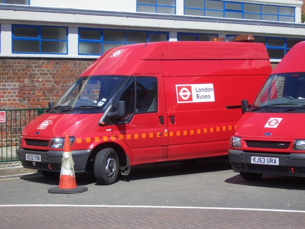 Details: Transit van 5298F (KE02YSN) has spent most of its life at North and East London Bus Stations, including Turnpike Lane where it was found on 8th May 2005. Note that these vehicles carry white LT roundels on a red background whereas this was reversed on later deliveries such as 5588F (KJ53URA) alongside. |