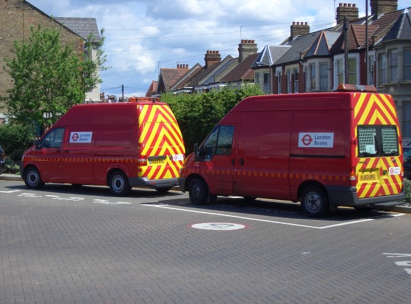 Details: The batch of London Buses vans leased in early 2005 were VW Transporter vans like 5668VW (RA54HXX) seen here on the left at Turnpike Lane on 8th May that year. High-roof vans are usually specified for this role, as shown by earlier Ford Transit 5580F (KJ53UPG) parked behind. 5580F had earlier been based at Edgware and Harrow Bus Stations. |