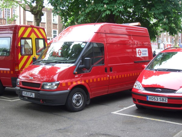 Details: The small car park in front of Sycamore House sometimes has as many as seven LBSL service vehicles crammed in it. On 14th May 2005 Ford Transit 5587F (KJ53UPL) was there, flanked by VW LT35 minibus 5613VW (RJ04WOB) more normally found at Eltham, and un-numbered Ford Galaxy VO53SBZ. |