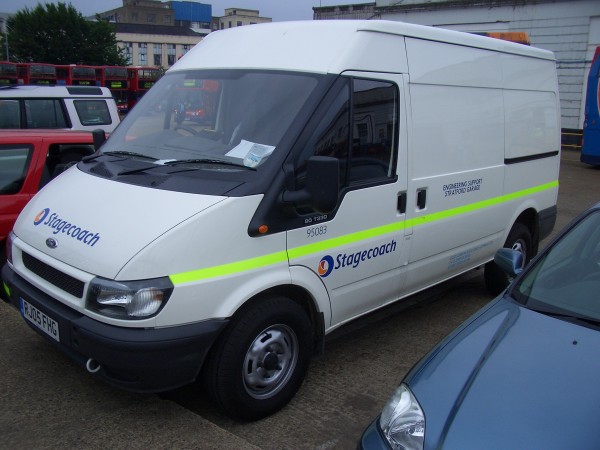 Details: A previously un-reported vehicle found at the main Waterden Road Stagecoach depot (SD) on June 25th 2005 was Ford Transit van 95083 (RJ05FHG). Unlike earlier vans this carried a white livery with a day-glo yellow stripe. |