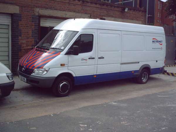 Details: An unusual vehicle seen at Edgware Road Station on 19th July 2003 is this Mercedes Sprinter van, numbered 5400 (LT02XML). This is the first Mercedes vehicle in the leased series, although no prefix is carried. The livery is underground standard with the addition of the red and blue chevrons of the Emergency Response Unit. Metronet is the branding of one of the new infrastructure maintenance units. A point of interest is that the registration number of this vehicle is in series with a batch of Mercedes 311 minibuses supplied to London's Dial-a-Ride operations, which came under the control of Transport for London recently. |