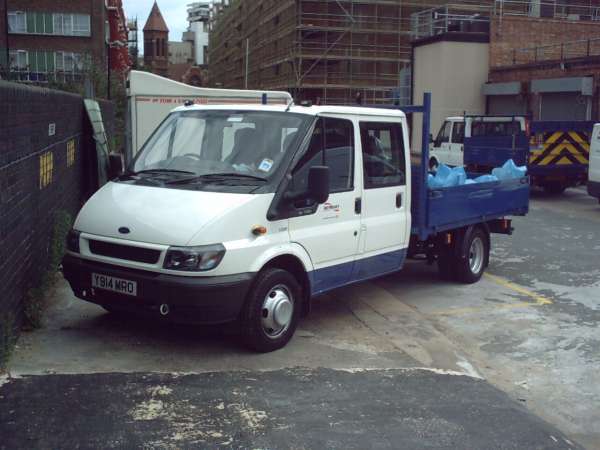 Details: One of the more common types in the present fleet is the Ford Transit drop-side. This one (5250F Y914MRO photographed at Edgware Road Station on 19th July 2003) is branded for Metronet and has a crew-cab, while the example in the background also has a tail-lift. Note that vehicles with separate bodywork have this painted all blue (in the case of low-sided vehicles) or all-white (on vans). |