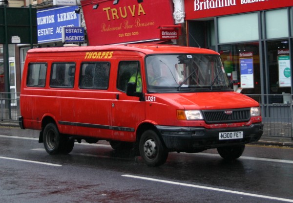 Details: Seen in a damp Golders Green on 15th June 2005, Thorpes LD21 N300FET is an LDV Convoy minibus formerly registered T921REU. The N300FET plate (For Frank E. Thorpe) was originally carried by an Optare Excel bus used on the Stationlink service. |