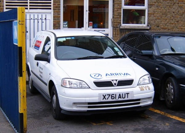 Details: The Arriva TOLST (Tour) fleet is based at Wandsworth garage and includes a number of service vehicles numbered in an MVxx series. Their MV9 was Vauxhall Astra van X761AUT, seen at home on 21st January 2005. The white livery has several logos applied, including the unique Arriva presenting London used by this operation. |